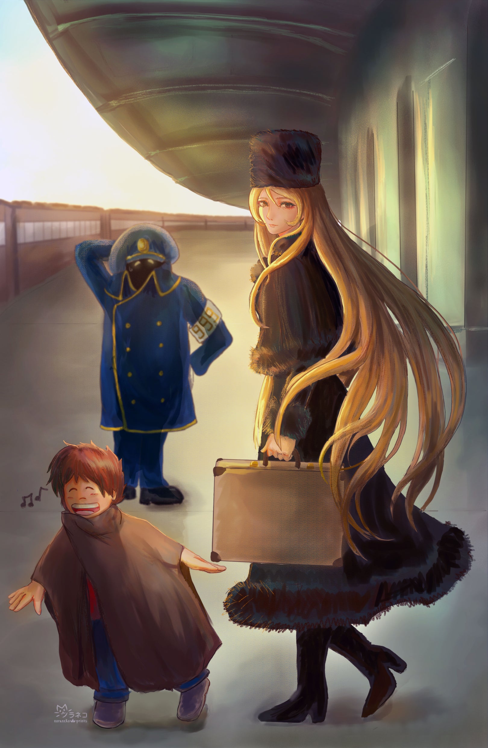 Hoshino Tetsuro, the elegant Maetel, and the Conductor prepare to board the 999 from Galaxy Express 999.