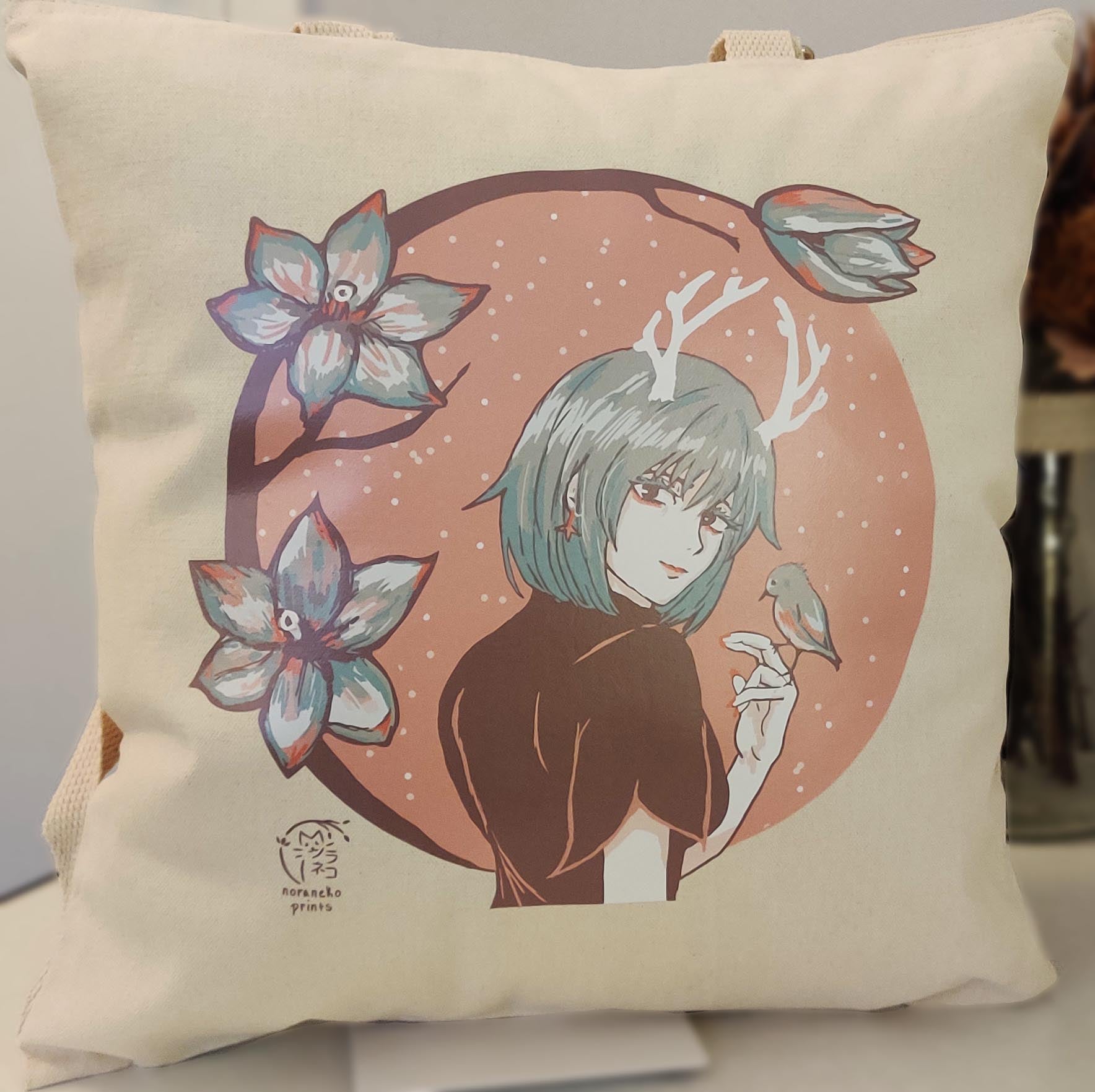A convertible tote bag featuring Noraneko's original character, Ran - who is surrounded by sun orchids in a dreamy coral and mint color palette.